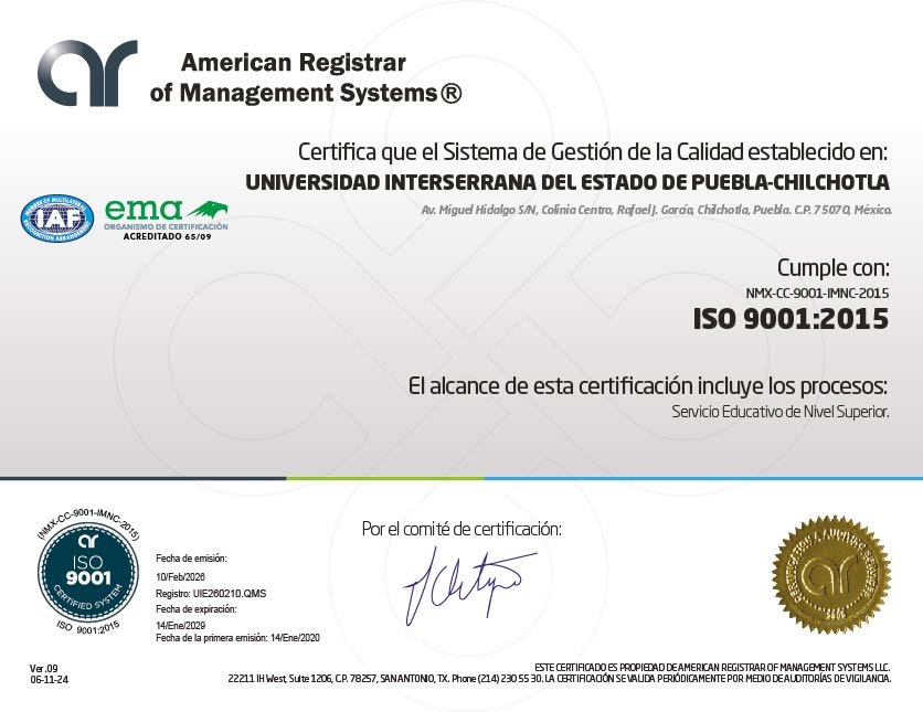 La Universidad Interserrana del Estado de Puebla-Chilchotla, asume el compromiso de implementar y orientar todos sus procesos estratégicos en un Sistema de Gestión Integrado hacia la calidad del servicio educativo, el respeto al medio ambiente, a través del cumplimiento de los requisitos legales y otros requisitos y la mejora continua de conformidad a las normas ISO 9001:2015, ISO 14001:2015.